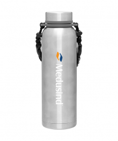 32 oz double wall 18/8 stainless steel thermal bottle with copper vacuum insulation, insulated stainless steel threaded lid, silicone ring, removable strap with buckles, removable clasps, and powder coated finish. Individual gift box. Hand wash recommended. Do not microwave. Complies with FDA, Prop 65. 11" H x 3.1875" W